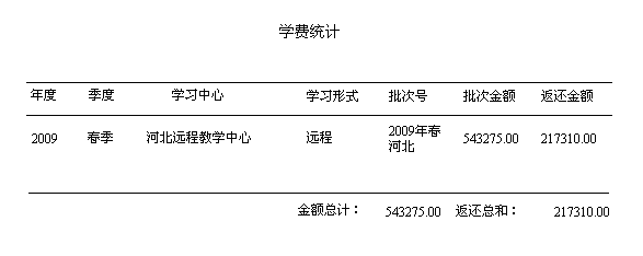 管理员学费结算---结算网院某一年度的所有学生的交费总额,返还总额和网院总额。