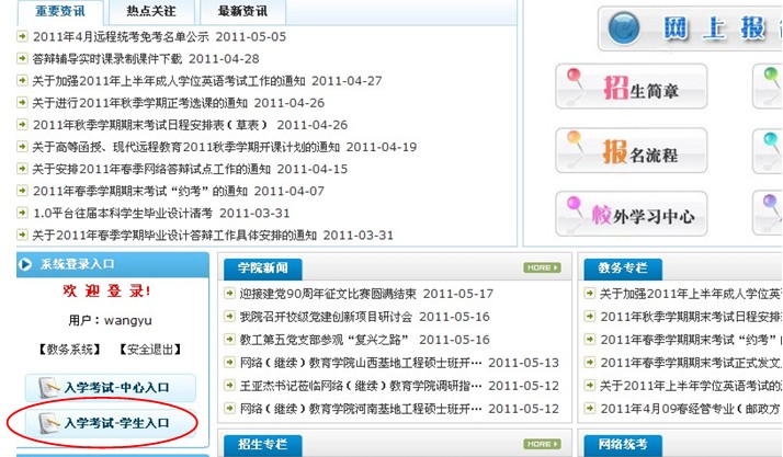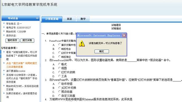 入学测试是检验学生知识水平的重要环节。为了更好地使学生熟悉计算机的使用,北京邮电大学现代远程教育的入学考试全面推行 “ 入学测试机考 ”, 为了保证机考的顺利进行,特制定学习中心机考考务规定。 考生必须到所属学习中心参加入学测试机考,否则成绩视为无效。 一. 考前准备工作 1. 学生应在学习中心完成报名信息审核手续之后,使用准考证号和报名时密码登录系统,确保用户名、密码有效。 2. 所有考生必须在考前 15 分钟到达考点进入考试教室。 3. 考生所带书籍、提包及资料存放在指定地方,关闭携带的通讯工具。 4. 考试开始前15分钟: 1) 在监考老师的组织下,考生应有秩序地进入考场。将不准带入考场的物品放到指定位置。 2) 将附有考生照片的有效证件,如:身份证和准考证放于座位左上角,以便监考人员核对。 3) 认真聆听监考老师的《考场规则》及考试的注意事项。 5. 考试开始前5分钟: 1) 在监考教师的指导下打开考试系统的登录界面。 2) 用用户名、密码登录机考系统。 3) 进入机考系统后,请逐项认真核对系统上学习中心、姓名、准考证号、层次、专业、照片等有关项目。若发现错误,请立即报告监考老师。 4) 待监考老师确认后,方可开始考试。 二.考试过程 1. 考试过程中考生不允许离开考场或退出成绩,否则成绩视为无效。 2. 入学测试机考全部为闭卷考试,禁止打开与考试无关的其他窗口。 3. 考试进行 30 分钟内提交试卷,成绩视为无效。 4. 考试过程中注意剩余考试时间,掌握考试进度。 5. 考试完毕后,提交试卷。 三.考试后工作 1. 全部测试科目考试完毕后,考生应立即按要求退出考试程序,不得拖延。 2. 根据监考老师要求,关闭计算机。 入学测试机考《考场规则》 一. 考生于开考前 15 分钟凭规定证件(身份证和准考证)进入考场,供监考人员查对。 二. 入学测试机考全部为闭卷考试,考生所带书籍、提包及资料存放在指定地方,关闭携带的通讯工具,禁止打开与考试无关的其他窗口。 三. 考生开考后 30 分钟内提交试卷,成绩视为无效。 四. 考生必须服从监考人员的管理,严格遵守考场纪律。对不服从监考人员的指导和规劝,扰乱考场秩序,或在考场交头接耳、传递纸条、夹带、窃视他人屏幕、代考等舞弊行为者,按违纪处理。 五. 机器出现故障,可举手询问,但不得请求监考或技术人员帮助操或对题意做任何解释或提示。 六. 考试期间必须保持安静,严禁吸烟。违反规定且不听劝阻者,令其退出考场。 七. 除本场考生及考试工作人员外,其他无关人员一律不得进入考场。 八. 考试结束,考生按考试要求结束考试程序,退离考场,提前结束考试退场者不得在考场附近逗留、喧哗。 入学考试操作指南 参加入学考试前提条件:报名学员必须到学习中心办理审核手续,持准考证参加入学考试。 操作步骤: 第一步:登录 http://nu.bupt.edu.cn/ ,页面左下方点击