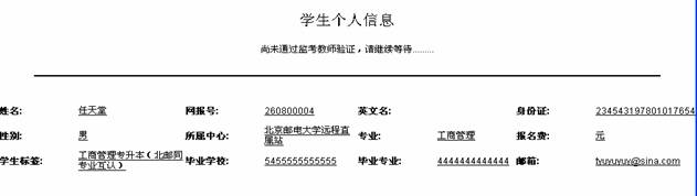 图 2 入学考试考生登录页面 第三步:考生在网报号框中输入准考证号码、密码(考生报名自行设定的密码),点击登录按钮进入考试系统,此时考生须认真核对本人报考信息,并等待监考教师验证,显示如图 3 所示: 图 3 学生个人信息页面 第四步:学习中心监考老师批准开考后,学生个人信息图3页面自动跳转到考试页面,如图4所示: