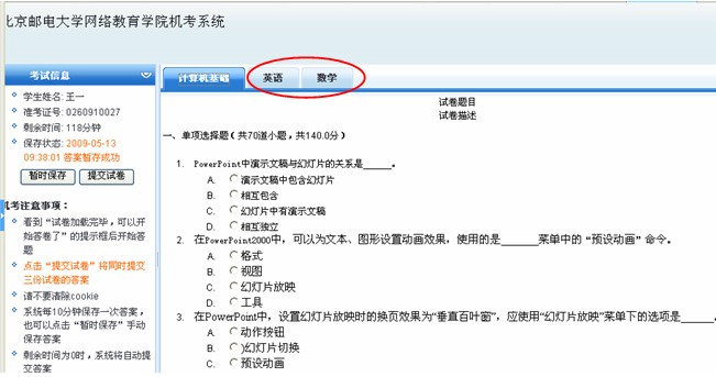 图 5 学生机考界面 第六步:考试过程中,每门试题答完可以点击